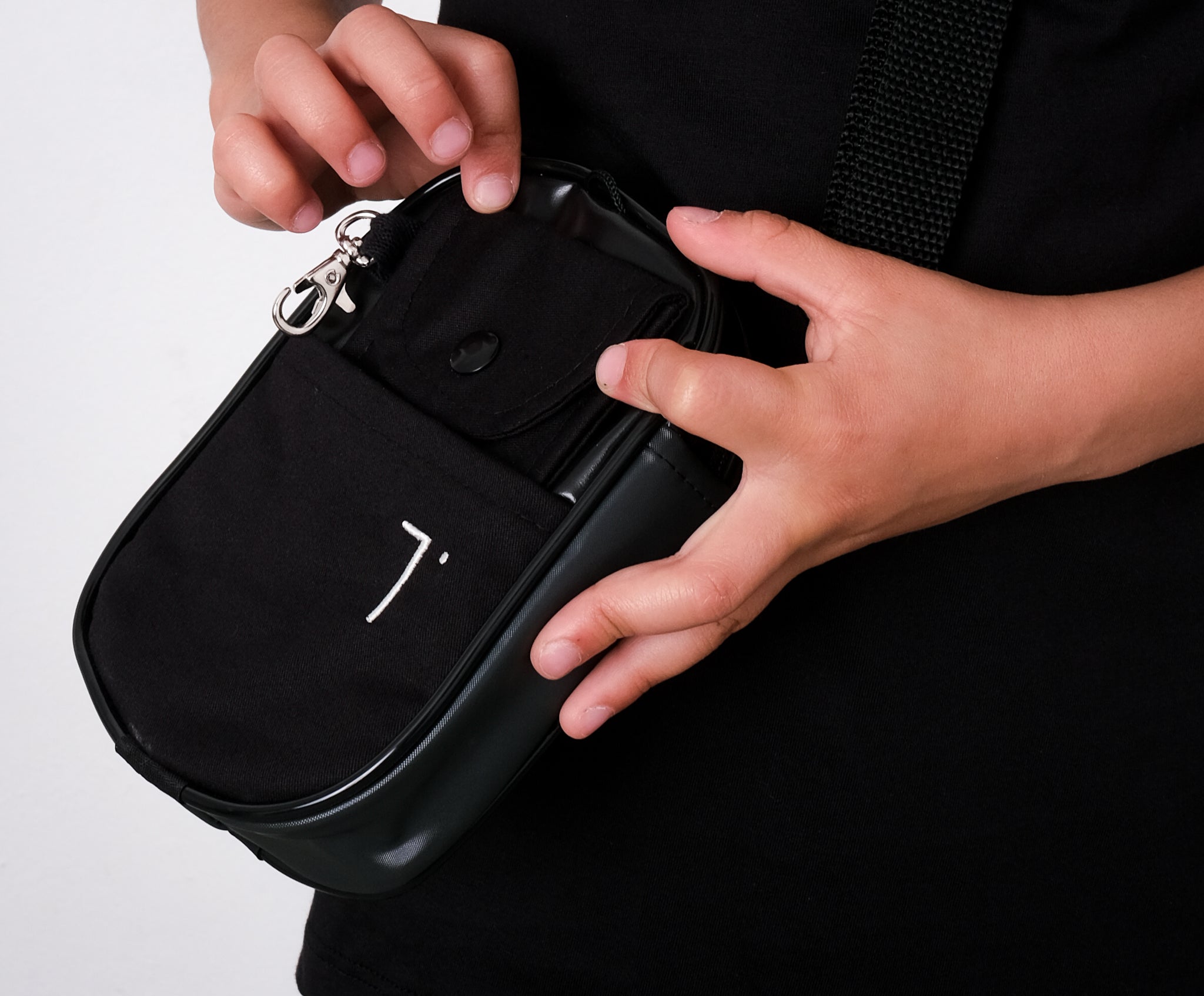 - A bolsa principal (15 x 11 cm) possui bolsinho frontal e bordado off-white com a logo da TITOU.